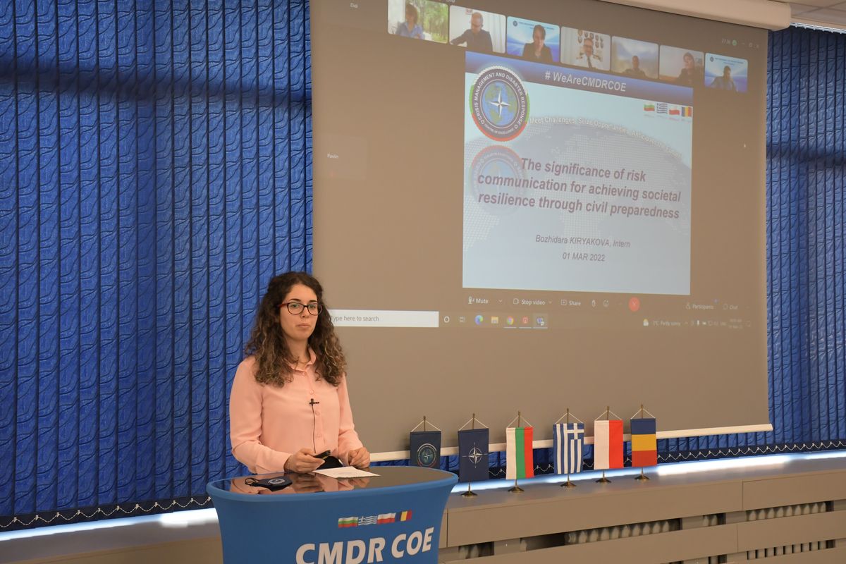 The CMDR COE Internship Research Paper presentation was delivered today, held in front of CMDR COE expert audience. Ms. Bozhidara Kiryakova presented her end-state internship research. She covers the topic "The Significance of Risk Communication for Achieving Societal Resilience through Civil Preparedness"